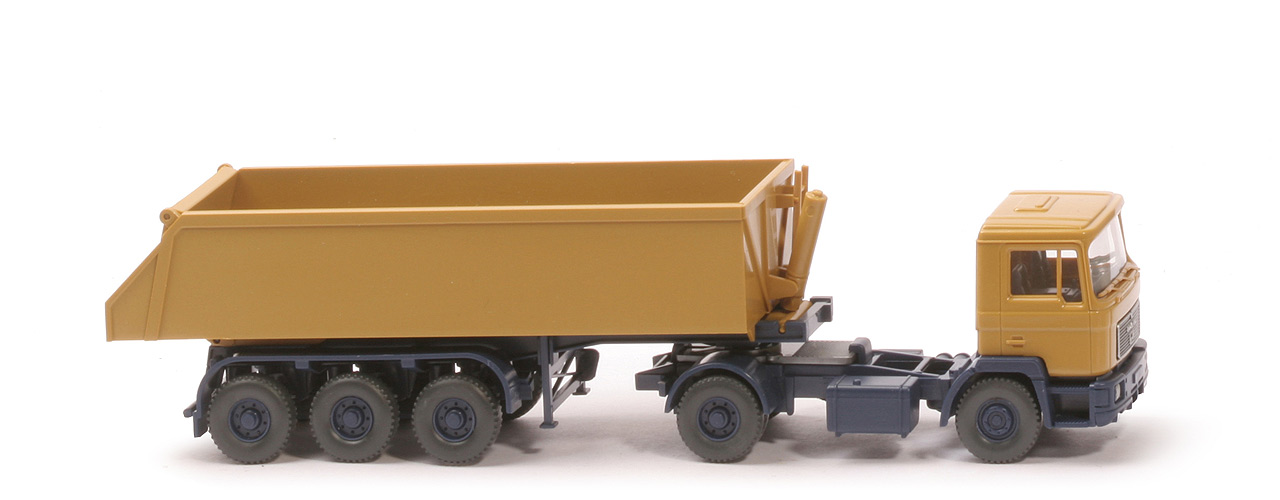 | Zugmaschine | Kabine | braungelb | eingesetzter Grill | schwarz | Bedruckung Grill | Rand, "M*A*N", Löwe silbern | Inneneinrichtung | stahlblau, Lkr separiert | Kabinenunterbau | stahlblau | Stoßstange, Kotflügel | stahlblau, Scheinwerfer silbern eingesetzt | Chassis | stahlblau, offen | Kardaneinsatz | stahlblau, Bodenprägung neues WIKING-Logo, Germany | Radlauf hinten | stahlblau | Reserverad | unter Chassis | Räder | Profil grob | Felgen | 8-Loch, stahlblau | | Auflieger | Mulde | braungelb | Klappe hinten | braungelb | Hydraulik | braungelb | Leiter | braungelb | Pritscheneinlage | Pappe silber | Chassis | stahlblau | Bodenprägung | WIKING - neues Logo, Germany | Dreiachsaggregat | stahlblau | Achsfixierung | stahlblau | Hydraulikstütze | braungelb | Räder | Profil grob | Felgen | 8-Loch, stahlblau |