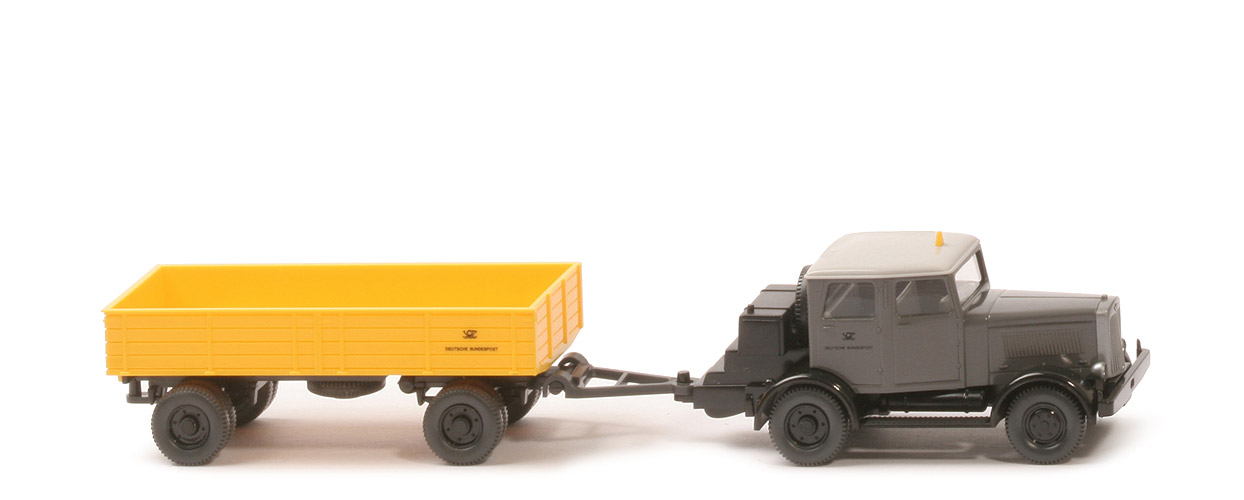 | Zugmaschine | Kabine Farbe | basaltgrau | Grill | silbern eingesetzt | Dach | ca. altweiß | Warndreieck | gelb | Inneneinrichtung | ca. lichtgrau | Lenkrad | integriert | Chassis | schwarz | Bodenprägung | WIKING Berlin-W | Druckluftbehälter | schwarz | Werkzeugkasten | schwarz | Reserverad | hinter Kabine | Beschriftung Seiten | Posthorn, "Deutsche Bundespost" | Räder | 11 mm | Felgen | schwarz eingesetzt | | Anhänger | Pritsche | gelb, mit Nummernschild | BP Pritsche | WIKING Berlin-W | Chassis | schwarz | Drehschemel | schwarz | Befestigung Drehschemel | Weichzapfen | Reserverad | unter Chassis gesteckt | Deichsel | Kunststoff anthrazit | Plane | ohne | Beschriftung Pritsche | Posthorn, "Deutsche Bundespost" | Räder | 11 mm | Felgen | schwarz eingesetzt |