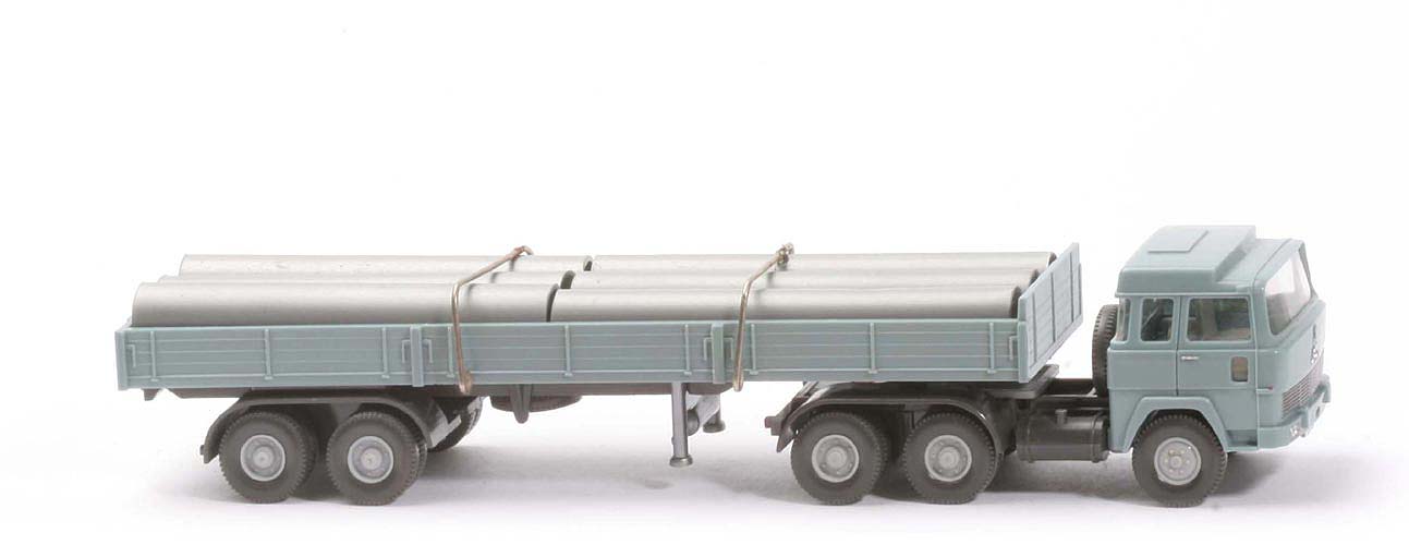 | | Zugmaschine | | Kabine oben | grünblau | | Kabine unten | grünblau | | Verglasung | klar | | Inneneinrichtung | ca. lichtgrau | | Lenkrad | ohne | | Grill | silber | | Chassis | anthrazit | | Radlauf hinten | anthrazit, 1-teilig | | Sattelpfanne | für den dünnen Königszapfen | | Reserverad | hinter Kabine | | Räder | Profil fein | | Felgen | silbergrau | | | Auflieger | | Farbe Pritsche | grünblau | | Pritschentyp | Pritsche mit niedriger Stirnseite | | Chassis | anthrazit | | Königsbolzen | dünn | | Pritscheneinlage | silbern, nicht verklebt, nur Hälfte der Pritsche | | Doppelachsaggregat | Klemmplatte | | Doppelachsaggregat Farbe | anthrazit | | Bodenprägung Achseinheit | Germany, Wiking | | Reserverad | ja | | Stütze | starr, silbern, Hydraulikstempel | | Ladung | 2x3 Röhren | | Räder | Profil fein | | Felgen | silbergrau |