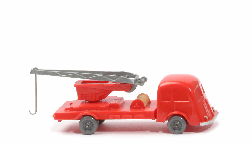 Achsen | Drahtachser | Farbe Kabine u. Chassis | orangerot | Bemalung Kabine | Scheinwerfer und Stoßstange silbern | Version Chassis | mit Schlitz | Bodenprägung | WM | Aufbau | orangerot | integrierte Schlauchhaspel | hellgelb bemalt | Drehkranz | orangerot | Kranausleger | silbern, eingesteckt | Kranhaken | umgebogene Stecknadel | Räder | 9 mm, ohne Profil |