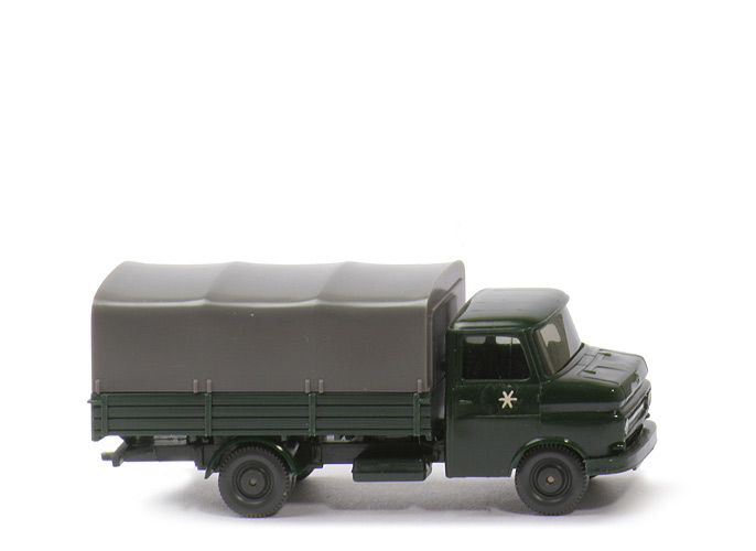 | Kabine | tannengrün, Türen mit Abziehbild Polizei-Stern | | Haube | gerade | | Dach | mit 4 Längsstreben | | Verglasung | leicht getönt (sehr gering erhaben) | | Inneneinrichtung | ohne | | Bemalung Scheinwerfer | silber | | Bemalung Grill u. Kennzeichen | ohne | | Chassis Farbe | tannengrün | | Chassis Bodenprägung | WIKING Germany | | Kotflügel hinten | tannengrün | | Pritsche Farbe | tannengrün | | Pritscheneinlage | mit 2 Sitzreihen, ca. grünbeige | | Plane | basaltgrau, hinten offen | | Räder | 9 mm, Nabe glatt | | Räder Farbe | anthrazit |