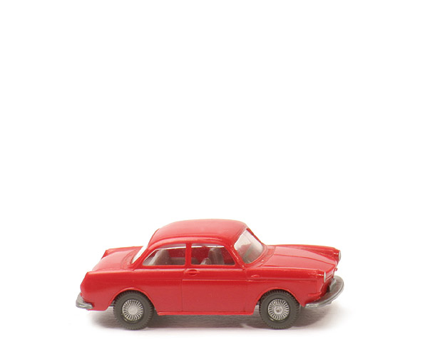 | Farbe | rot | | Haube | eckig | | Blinker vorne | umlaufend | | Verglasung | klar | | Inneneinrichtung | mit, ca. lichtgrau | | Lenkrad | separat eingesetzt, ca. anthrazit | | Bemalung Scheinwerfer | silber | | Bemalung Rückleuchten | ohne | | Chassisfarbe | silbern | | Chassis Typ | Version 4: o. Hörner | | Bodenprägung | MiG, VW 1600, WM | | Haltestreben Stoßstange | je drei | | Stoßstangenhörnchen | ohne | | Räder Typ | Riffelkappe | | Räder Farbe | ca. anthrazit, Felge gesilbert |