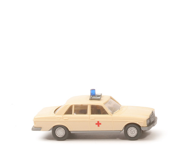 Farbe Karosserie | creme | Außenspiegel | nur links | Blaulicht | auf Signalhornaufsatz | Grill | silbern, Teil des Chassis | Verglasung | klar | Inneneinrichtung | ca. gelbgrau | Lenkrad | integriert | Chassis Farbe | silbern | Bodenprägung | Mercedes/240D/WIKING/Berlin-W | Bedruckung | Rotkreuz auf Vordertüren | Räder Typ | mit Mercedes-Stern | Räder Farbe | anthrazit | Felgen | gesilbert |