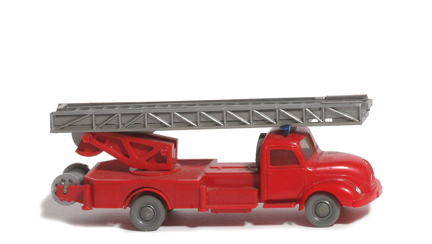 | Farbe Kabine | rot | | Version Kabine | Typ 4 | | Stoßstange | gerade | | Kabinenboden | mit Schlitz | | Blinker | ohne | | Verglasung | getönt | | Dach | glatt mit Blaulichtleiste | | Bemalung | nur Scheinwerfer silbern | | Reserverad | hinter Kabine | | Chassis Farbe | rot | | Chassis Art | Version 3a | | Achshalterungen | offen | | Chassis Bodenprägung | WM (ohne Kreis), Made in Gemany | | Zughaken | entfernt | | Aufbau Farbe | rot | | Aufbau Variante | Trittfläche Struktur | | Führungsstege für Chassis | 2, seitlich | | Drehschemel | Version 2, rot | | Leiter | dreiteilig, silbern | | Schlauchhaspel Typ | alt | | Schlauchhaspel Seiten | silber | | Schlauch | basaltgrau | | Räder | 10 mm, neuere Version |