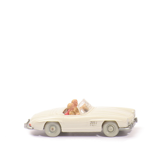| Farbe Karosserie | hellgrauweiß | | Windschutzscheibe | separat eingeklebt | | Scheinwerfer | silbern bemalt | | Sitze | rot | | Figuren | beige | | Lenkrad Art | separat eingesetzt, 2-speichig | | Lenkrad Farbe | beige | | Chassis Farbe | silbern | | Bodenprägung | WM | | Bemalung Grill | ohne | | Bemalung Rückleuchten | rot | | Räder Typ | 8 mm, Nabe gewölbt | | Räder Farbe | ca. achatgrau |
