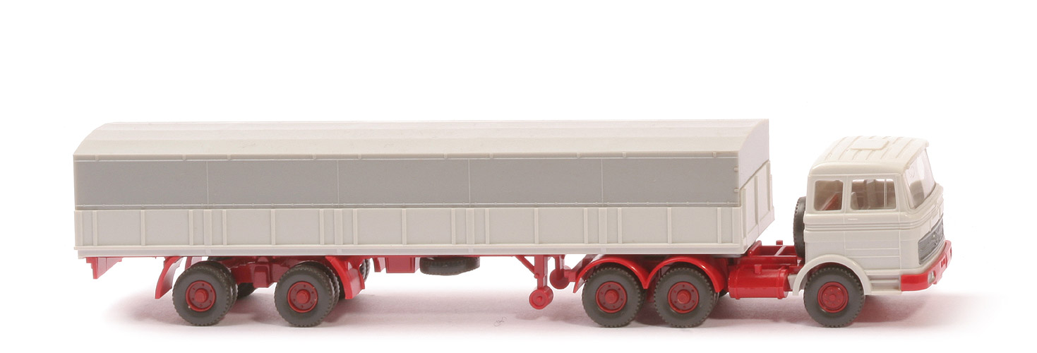 | Zugmaschine | Typ | Dach querversteift | Kabine | altweiß | Spiegel | ohne | Scheibenwischer | ohne | Verglasung | klar | Lenkrad | ohne | Inneneinrichtung | ca. lichtgrau | Stoßstange | rot, Scheinwerfer gesilbert | Chassis | rot | Zentriernippel für Pritsche | ohne | Radlauf hinten | zweiteilig rot | Reserverad | hinter Kabine | Sattelpfanne | für großen KöBo | Räder | Profil grob | Felgen | hellbraunrot | | Auflieger | Pritsche Farbe | altweiß | Chassis Farbe | rot | Pritscheneinlage | Pappe, silbern | Plane Farbe | silbergrau | Reserverad | unter Auflieger, gesteckt | Unterfahrschutz | ohne | Königsbolzen | stark | Räder | Profil grob | Felgen | hellbraunrot |