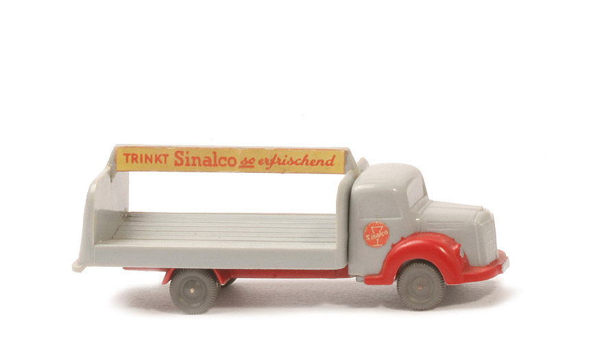 | Achsen | Rollachser | | Farbe Kabine u. Chassis | silbergrau | | Kabinenboden | silberne Platte | | Bodenplatte Prägung | WM im Kreis | | Typ Chassis | mit Kipperschlitz | | Zughaken | (immer) ohne | | Aufbau | silbergrau | | Heckwand | silbergrau | | Steg | silbergrau | | Rückleuchte | ohne | | Bemalung vorne | Scheinwerfer, Kennzeichen silber | | Bemalung Kotflügel, Stoßstange | rot | | Bemalung Kennzeichen hinten | silber | | Beschriftung Steg | TRINKT Sinalco so erfrischend | | Beschriftung Heck | TRINKT Sinalco gekühlt | | Beschriftung Türen | Sinalco | | Art der Beschriftung | Papieraufkleber | | Räder | 10mm, ältere Ausführung |