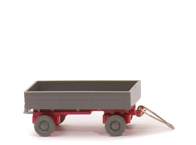 | Pritsche | Pritsche Farbe | basaltgrau | Pritschenseiten | mit Struktur | Pritscheneinlage | ohne | Kennzeichen hinten | einteilig | | Chassis | Chassis Variante | Typ 2 | Chassis Farbe | rot | Achshalterungen | offen | Drehschemel | eingesteckt | Bodenprägung Drehschemel | WM | Bodenprägung Chassis | ohne | Zughaken | silbern, Typ LKW, unter Chassis geklebt | | weitere Details | Deichsel | Metall | Bemalung Rückleuchten | ohne | Bemalung Kennzeichen | ohne | Räder | 10 mm, staubgrau, neuere Ausführung |