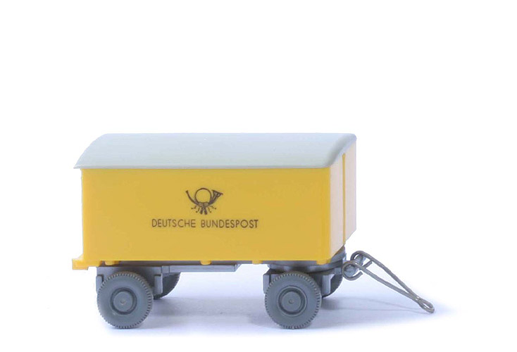 | Koffer Farbe | gelb | | Koffer | Typ 2b | | Rückleuchten | neu, nicht bemalt | | Positionslichter vorn | ohne | | Türaufnahmen | unten geschlossen | | Türen Farbe | gelb | | Türen Typ | Griff als Lasche, ohne Rand | | Dach | glatt, ohne Rand und ohne Positionsleuchten | | Dach Farbe | hellgelbgrau | | Nummerschild | mit | | Beschriftung | Posthorn, Deutsche Bundespost (...siehe Foto) | | Beschriftung Art | Druck, Breite 21 mm (Typ 1) | | Chassis Farbe | silbern | | Zughaken | ohne | | Achshalterungen | offen | | Drehschemel | gesteckt | | Bodenprägung Drehschemel | WM | | Bodenprägung Chassis | ohne | | Bemalung | ohne | | Deichsel | Metall | | Räder | 11 mm, Glattwand | | Räder Farbe | ca. betongrau |
