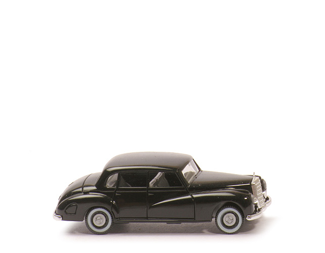 Farbe Karosserie | schwarz | Scheinwerfer | klar transparent, eingesetzt | Nebelscheinwerfer | verchromt, Teil der Stoßstange | Grill | verchromt, mit Stern | Verglasung | klar | Inneneinrichtung | ca. lichtgrau, Lkr separiert | Stoßstangen | verchromt | Chassis Farbe | silbern | Bodenprägung | neues WIKING-Logo, Germany | Räder Art | MB-Radkappen, Weißwand | Felgen | gesilbert |