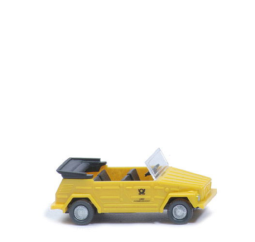 Farbe Karosserie | gelb | Windschutzscheibe | eingeklebt | Inneneinrichtung | schwarz | Abdeckung Verdeck | schwarz | Lenkrad | 3-speichig, separat eingesetzt | Chassis Farbe | schwarz matt | Bodenprägung | VW 181 Wiking Germany | Beschriftung | stilisiertes Posthorn, DBP Fernmeldedienst | Beschriftung Art | Druck | Bemalung vorne | Scheinwerfer | Bemalung hinten | ohne | Räder | Riffelkappe | Felgen | silbern bemalt |