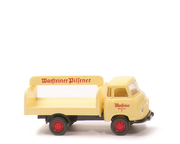 | Kabine | schwefelgelb | | Verglasung | klar | | Bemalung Scheinwerfer | silber | | Bemalung Grill | ohne | | Bemalung Kennzeichen | ohne | | Inneneinrichtung | ohne | | Chassis | schwarz | | Bodenprägung | Wiking Germany | | Aufbau | schwefelgelb | | Steg | schwefelgelb | | Bodenprägung Aufbau | Wiking | | Rückleuchten | unbemalt | | Nummernschild hinten | unbemalt | | Bedruckung Türen | "Warsteiner Brauerei" | | Bedruckung Steg | "Warsteiner Pilsener" | | Bedruckung Heck | "Warsteiner Brauerei" | | Ladegut | ohne, kein Bier, nix | | Räder | 9 mm, Felgen eingesetzt | | Felgen | rot |