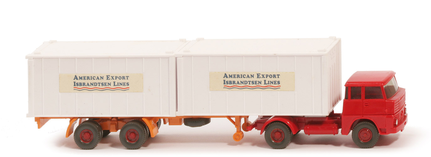 | | Zugmaschine | | Kabine oben | rot | | Kabine unten | rot | | Verglasung | getönt | | Chassistyp | neu | | Zughaken | ohne | | Fläche hinter Sattelpfanne | 3 Stege | | Chassisfarbe | rot | | Sattelpfanne | für großen Königsbolzen | | Reserverad | ohne | | Räder | 12mm, Profil grob | | Felgen | hellbraunrot | | | Container | | Art | 2 x 20 ft, gerippt | | Dach | reinweiß | | Korpus | reinweiß | | Türen | reinweiß | | Beschriftung | American Export ... (s. Foto) | | Beschriftung Größe | 5 Felder, Papieraufkleber | | | Auflieger | | Farbe | gelborange (Werbe) | | Unterfahrschutz | ohne | | Königsbolzen | stark | | Räder | 12mm, Profil grob | | Felgen | hellbraunrot |