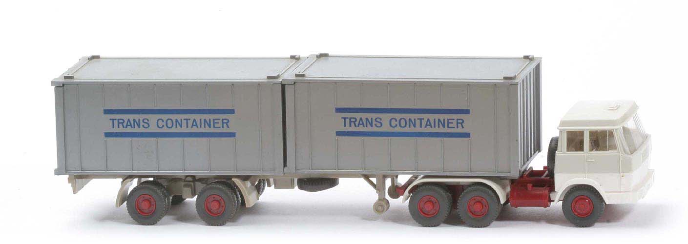 | Zugmaschine | Kabine oben | grauweiß | Kabine unten | weiß | Verglasung | klar | Inneneinrichtung | 2 Sitze, Motorblock, hellgelbgrau | Lenkrad | ohne | Chassis | hellbraunrot | Radlauf hinten | grauweiß, 1-teilig | Sattelpfanne | für großen Königsbolzen | Reserverad | hinter Kabine | Räder | Profil grob | Felgen | hellbraunrot | | Container | Art | 2 x 20 ft gerippt | Farbe | silbern | Beschriftung | Trans Container (s. Foto) | Beschriftung Art | 5 Felder, Druck | | Auflieger | Farbe | olivgrau | Unterfahrschutz | ohne | Königsbolzen | stark | Räder | Profil grob | Felgen | hellbraunrot |