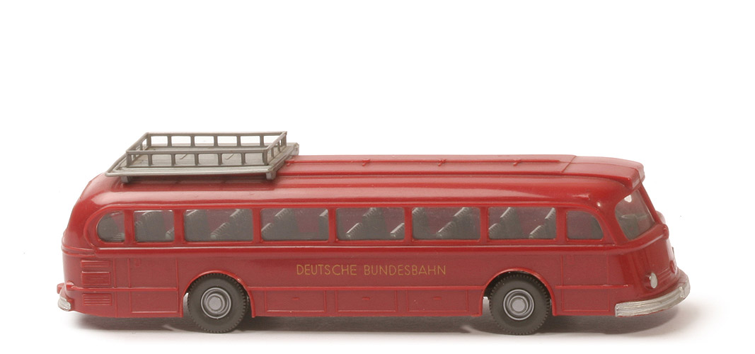 | Verglasung | mit | | Farbe Karosserie | hellbraunrot | | Dach Mittelbereich | mattiert mit Lüftern | | Kombination Dach/Gepäckbrücke | Kombination 5 | | Verglasung | leicht getönt | | Sitze | grünmetallic | | Fahrer | basaltgrau | | Lenkrad | anthrazit, 4 speichig | | Heck | mit angedeuteter Kupplung | | Gepäckbrücke | mit Mittelsteg | | Chassis Farbe | anthrazit | | Chassis Typ | Struktur, BP WIKING Germany | | Bemalung vorne | Scheinwerfer, Stoßstange silbern | | Bemalung Heck | Stoßstange silbern | | Beschriftung | Deutsche Bundesbahn | | Beschriftung Art | Druck | | Räder | 12mm, zweiteilig, Profil fein | | Radkappen | silbern eingesetzt |