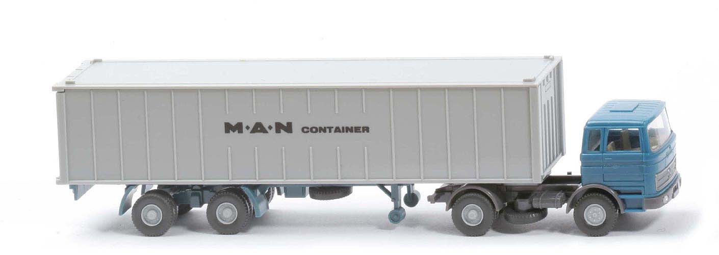 | | Zugmaschine | | Kabine oben | azurblau | | Kabine unten | azurblau | | Streifen | ohne | | Verglasung | klar | | Inneneinrichtung | ca. gelbgrau | | Lenkrad | mit | | Grill | silbern | | Stoßstange, Radlauf vorn | basaltgrau | | Chassistyp | neu | | Chassisfarbe | basaltgrau | | Radlauf hinten | basaltgrau | | Reserverad | unter Chassis | | Sattelpfanne | für großen Königsbolzen | | Räder | 12mm, Profil grob | | Felgen | silbergrau | | | Container | | Art | 1 x 40 ft gerippt | | Dach | silbergrau | | Korpus | silbergrau | | Türen | silbergrau | | Unterkante | breit | | Beschriftung | MAN Container (s. Foto) | | Beschriftung Grösse | Druck | | | Auflieger | | Farbe | diamantblau | | Unterfahrschutz | ohne | | Königsbolzen | stark | | Räder | 12mm, Profil grob | | Felgen | silbergrau |
