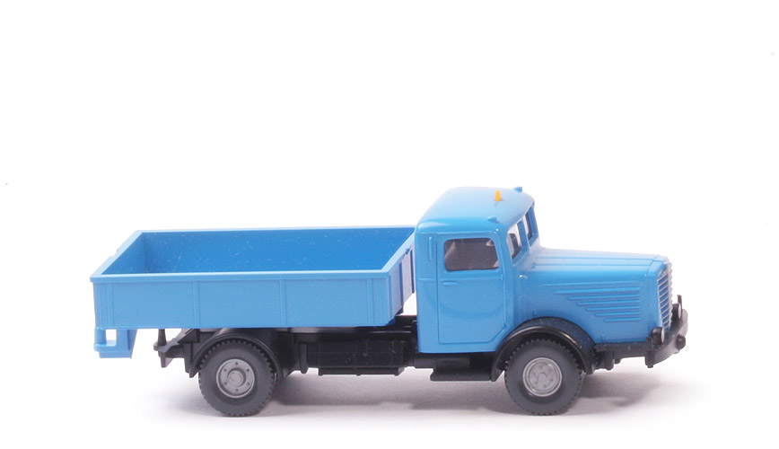 Kabine | himmelblau | Verglasung | klar | Inneneinrichtung | schwarz, Lkr integriert | Bedruckung Scheinwerfer | silbern | Bedruckung Grill | silbern | Warndreieck | gelb | Koflügel vorne | schwarz | Chassis Farbe | schwarz | Sattelpfanne | für großen Königsbolzen | Bodenprägung | neues Wiking-Logo, Germany | Zughaken | stark | Reserverad | ohne | Koflügel hinten | schwarz | Pritsche | himmelblau | Pritscheneinlage | ohne | Räder Typ | 12 mm, Felgen eingesetzt | Felgen | 6-Loch, silbern |