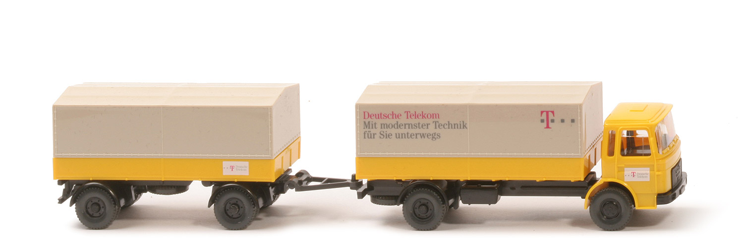 | Pritschenwagen | Fahrerhaus | gelb | Verglasung | klar | Inneneinrichtung | schwarz, mit integriertem Lkr | Grill | schwarz, eingesetzt | Scheinwerfer | ungesilbert | Chassis | schwarz, Bodenprägung neues WIKING-Logo, Germany | Zughaken | kurz (ca. 5 mm) | Radlauf hinten | schwarz | Reserverad | hinten unter Chassis, 12 mm | Pritsche | gelb | Pritscheneinlage | Papier silbern | Plane | helles rotelfenbein | Räder | 12mm, Profil grob | Felgen | 6-Loch, schwarz | | Anhänger | Pritsche | gelb | Chassis | schwarz | Radläufe | Typ 3, schwarz | Reserverad | mittig unter Chassis | Pritscheneinlage | Papier silbern | Deichsel | Kunststoff anthrazit | Plane | helles rotelfenbein | Räder | 12mm, Profil grob | Felgen | 6-Loch, schwarz | | Beschriftung | Türen | "T Deutsche Telekom" | Plane Zugwagen | "Deutsche Telekom, ..." (s. Foto) | Pritschen Anhänger | "T Deutsche Telekom" | Beschriftung Art | Druck pink und grau, tlw. auf weißer Fläche |