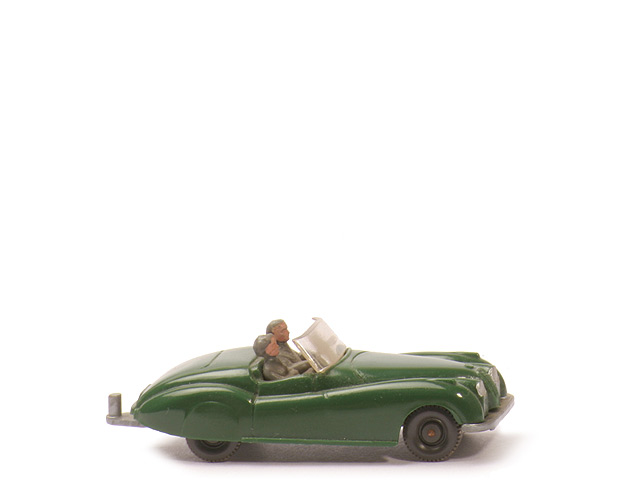 | Windschutzscheibe | gerundet, Spritzteil | | Farbe Karosserie | laubgrün | | Grill | 4 Streben (Grill grob) | | Trittbretter | mit | | hintere Stoßstange | Teil der Karosserie | | Lenkrad | separat eingesetzt, 3-speichig | | Figuren Farbe | ca. basaltgrau | | Bemalung Figuren | Gesichter | | Chassisfarbe | silbern | | Achshalterung | offen | | Bodenprägung | Jaguar-Sport, WIKING Germany, 2 | | Schlepploch | ohne | | Zughaken | integriert, dreieckig, geschlossen | | Bemalung vorn | Scheinwerfer silbern | | Bemalung hinten | ohne | | Räder Farbe | anthrazit | | Räder Typ | Profil, 8 mm |