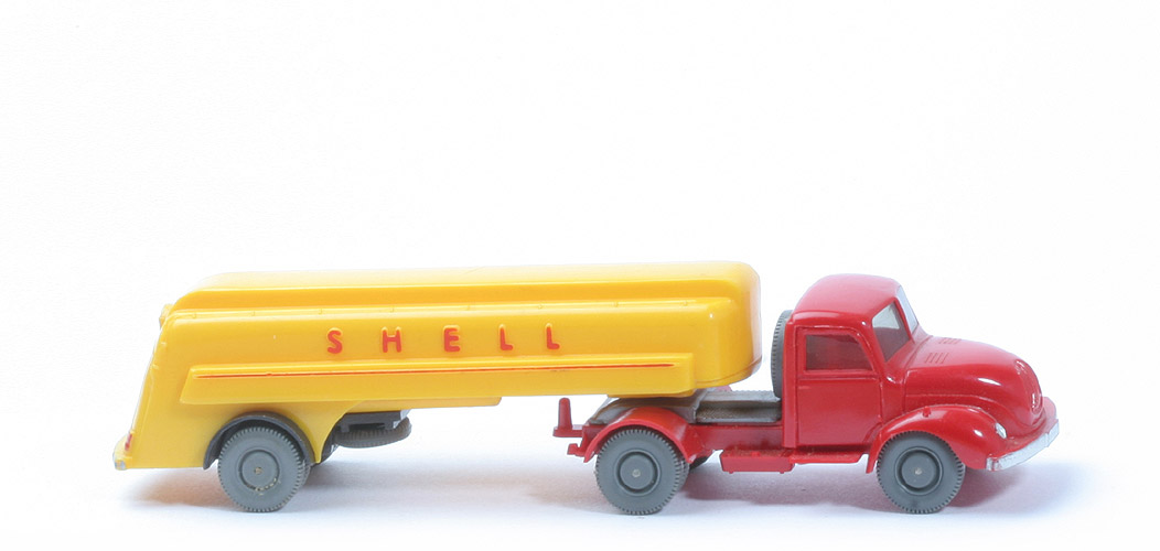 | Zugmaschine | Farbe Kabine | rot | Version Kabine | Typ 4a | Stoßstange | senkrecht | Kabine unten | mit Schlitz | Blinker | mit | Verglasung | getönt | Farbe Chassis | rot | Bemalung | Scheinwerfer, Stoßstange | Sattelpfanne | alt, mit Steg, für kleinen KöBo | Achshalterungen | offen | Bodenprägung | WM (ohne Kreis) | Reserverad | hinter Kabine | Räder | 11 mm | | Auflieger | Farbe Oberteil | gelb | Farbe Unterteil | gelb | Farbe Achseinheit | anthrazit | Königsbolzen | integriert, mit Ring | Position Königsbolzen | zentral auf Aufnahmeplatte | Bodenprägung Auflieger Chassis | ohne | Achshalterungen | geschlossen | Bodenprägung Achseinheit | WM im Kreis | geprägter Streifen | schmal | Beschriftung | Shell (s. Foto) | Beschriftung Art | geprägt, ohne Heckbeschriftung | Bemalung Rückleuchten | rot | Bemalung Stoßstange | silber | Räder | 11 mm |