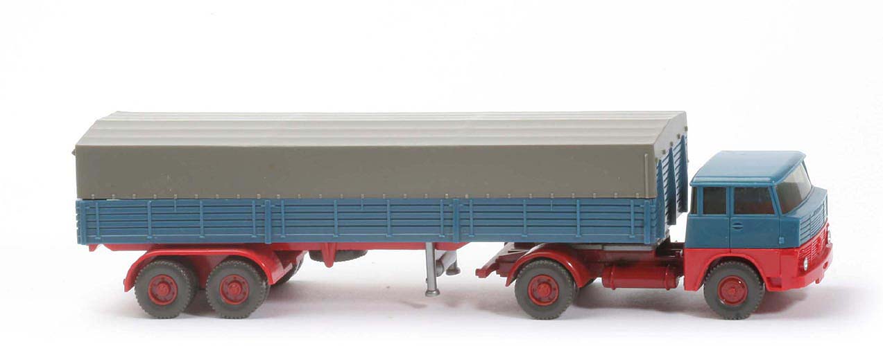 | Zugmaschine | Kabine oben | azurblau | Kabine unten | rot | Verglasung | getönt | Stege für Inneneinrichtung | ja | Chassistyp | neu | Zughaken | ohne | Fläche hinter Sattelpfanne | 3 Stege | Chassisfarbe | hellbraunrot | Sattelpfanne | neu, Übergangsversion, für den kleinen KöBo | Reserverad | unter Chassis gesteckt | Räder | 12mm, Profil grob | Felgen | hellbraunrot | | Auflieger | Farbe Pritsche | azurblau | Pritschentyp | ohne Lasche | Chassis | rot | Prägung Chassis | Wiking - ohne 51 h | Pritscheneinlage | silber | Achseinheit | rot | Typ Achseinheit | Germany/Wiking | Königsbolzen | dünn, integriert | Stütze | starr | Plane | Seite glatt, vorne Aussp | Plane Farbe | betongrau | Räder | 12mm, Profil grob | Felgen | hellbraunrot |