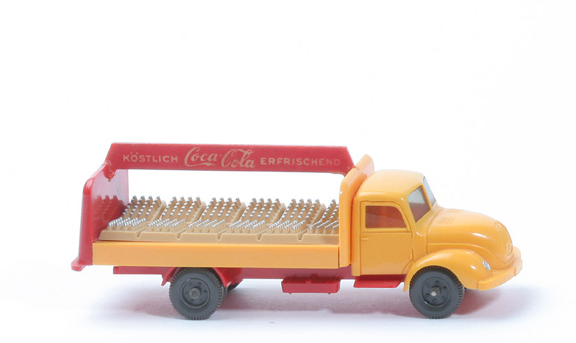 Farbe Kabine | chromgelb | Version Kabine | Typ 4 | Stoßstange | gerade | Kabinenboden | mit Schlitz | Blinker | ohne | Verglasung | getönt | Bemalung | nur Scheinwerfer silbern | Chassis Farbe | rot | Chassis Art | Version 3b | Achshalterungen | offen | Chassis Bodenprägung | WM (ohne Kreis) und Made in .. | Zughaken | werksmäßig entfernt | Rückleuchten am Chassis | mit | Aufbau Farbe | chromgelb | Aufbau Bodenprägung | mit WM | Steg | rot | Heck | rot | Rückleuchten | mit | Beschriftung Steg | Köstlich ... (s. Foto) | Beschriftung Heck | TRINK Coca-Cola | Beschriftung Art | Papieraufkleber | Räder | 11 mm, 6-Loch, anthrazit | Ladung | ungeklebt, beige |