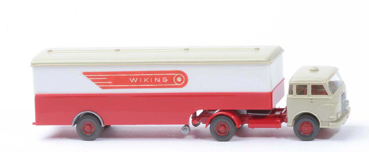| | Zugmaschine | | Fahrerhaus | hellgelbgrau | | Verglasung | getönt | | Sitze | ca. betongrau | | Chassis | rot | | Zughaken | mit | | Sattelpfanne | alt, mit Steg, für kleinen KöBo | | Fläche hinter Sattelpfanne | geriffelt | | Reserverad | ohne | | Räder | Profil fein | | Felgen | hellbraunrot | | | Auflieger | | Farbe Dach | hellgelbgrau | | Farbe oben | weiß | | Farbe unten | rot | | Türen | alt (glatt) | | Rückleuchten | lang | | Königsbolzen | dünn, Pilz, silbern | | Reserverad | ohne | | Beschriftung | Papieraufkleber "WIKING" | | Räder | Profil fein | | Felgen | hellbraunrot |