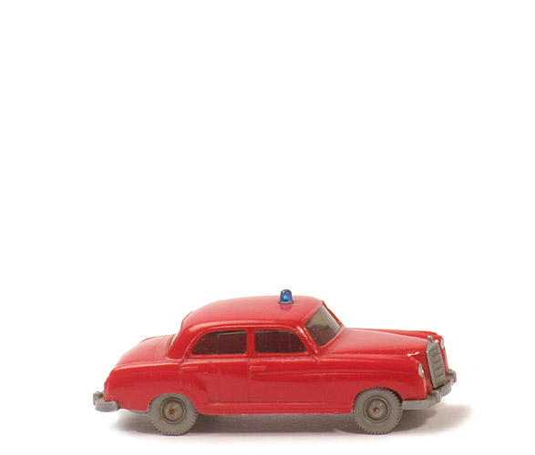 Farbe Karosserie | rot | Blaulicht | auf Dach verklebt | Bemalung vorne | Scheinwerfer, Nebelscheinwerfer silber | Bemalung Rückleuchten | orange | Grill | silbern, eingesetzt, mit Stern | Verglasung | getönt | Inneneinrichtung | ohne | Chassis Farbe | silbern | Bodenprägung | WM, Merc. 220 | Ölwanne | gerillt | Räder | ca. silbergrau |