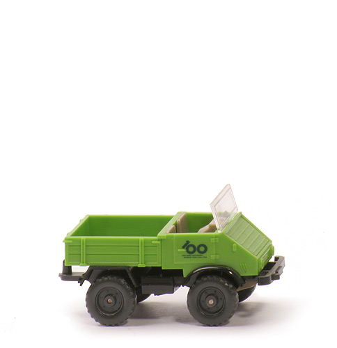 | Farbe Kabine und Pritsche | gelbgrün | | Frontscheibe | Plastik | | Grill | gröbere Struktur, waagerechte Vertiefungen | | Türen | erhaben, mit Scharnieren und Türgriffen | | Inneneinrichtung Ausführung | separat eingesetzt | | Inneneinrichtung Farbe | graubeige | | Fahrerfigur | ohne | | Lenkrad | separat eingesetzt, anthrazit | | Pritschenseiten | gerade Verbretterung | | Farbe Chassis | schwarz | | Bodenprägung | WM, Germany, 37 n | | Kardaneinheit | separat eingesetzt | | Farbe Kardaneinheit | schwarz | | Rückleuchten | auf den hinteren Kotflügeln | | Reserverad | auf Chassis | | Pritscheneinlage | silbern | | Bemalung Front | ohne | | Bemalung Heck | ohne | | Beschriftung | Druck 100 Jahre | | Räder | 10 mm, anthrazit, grobes Profil Unimog |