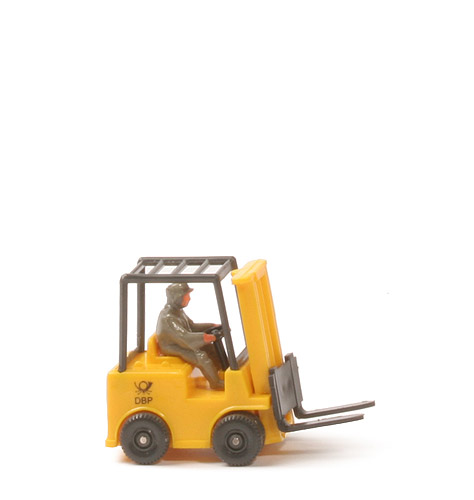 Farbe Aufbau | gelb | Fußbodenfläche | mit Riefen | Bohrlöcher als Dachaufnahme | mit | Lenkrad | schwarz, 3-speichig | eingesetztes Chassis | gelb | Bodenprägung | neues WIKING-Logo, Germany | Bedruckung seitlich | "DBP", Posthorn | Schutzdach | anthrazit | Hubgestell | gelb | Hubarme | anthrazit | Fahrer | ca. felsgrau | Räder Farbe | anthrazit | Räder vorne | 7 mm, Doppelbereifung | Räder hinten | 7 mm, Einfachbereifung | Ladung | ohne |