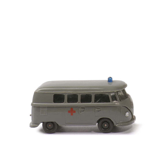 | Farbe Karosserie oben | betongrau | | Farbe Karosserie unten | betongrau | | Heckscheibe | klein | | Chassis | Teil des Karosserieunterteils | | Chassis Version | Typ B Nest 1 | | Bodenprägung | Made in Germany, WM | | Rückleuchten | gering erhaben | | Mittelholm | oben gerade | | Verglasung | Typ 3, getönt, eine Bohrung | | Inneneinrichtung | ohne | | Dachaufbau | ohne | | Blaulicht | auf dem Dach verklebt | | Rotes Kreuz | Druck | | Bemalung Scheinwerfer | silbern | | Bemalung VW-Emblem | ohne | | Bemalung Stoßstangen | ohne | | Bemalung Kennzeichen hinten | ohne | | Bemalung Rückleuchten | rot | | Räder | 8 mm, anthrazit, Nabe flach |