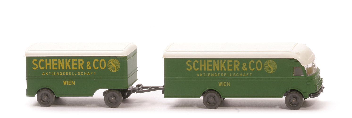 | Zugwagen | Aufbau Farbe | ca. zederngrün lackiert | Blinker vorne | mit | Verglasung | klar | Inneneinrichtung | schwarz | Fahrer | ohne | Kotflügel | Teil des Aufbaus | Rückleuchten | klein | Dach Farbe | weiß | Dach Art | matt, mit Positionsleuchten, mit Streben | Türen | weiß | Türen Art | Typ 3: niedrig, mit Streben, mit Griff | Chassis Art | Typ 4 | Chassis Farbe | schwarz | Bodenprägung Motorblock | Punkt | Bodenprägung hinten | WIKING GERMANY | Achshalterung vorne | offen | Achshalterung hinten | offen | Fläche unter hinterem Kardan | geschlossen | Fläche hinter Hinterachse | geschlossen | Tank | mit | | Anhänger | Aufbau Farbe | ca. zederngrün lackiert | Kotflügel | Teil des Aufbaus | Dach Farbe | weiß | Dach Art | matt, mit Streben | Türen | weiß, hoch, neu | Chassis Farbe | schwarz | Bodenprägung | WIKING GERMANY ohne 50a | Beschriftung | Schenker & Co... (s. Foto) | Räder | 11mm 6-Loch Profil fein |
