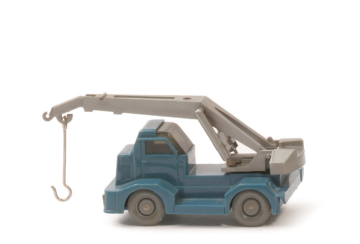 | Farbe Karosserie | azurblau | | Verglasung | getönt | | Bemalung Scheinwerfer | ohne | | Chassis | azurblau | | Bodenprägung | WM, Germany, 68 | | Kran Unterbau mit Gegengewicht | silbern, drehbar | | Kran Aufbau mit Hydraulik | silbern, hochschwenkbar | | Kran Ausleger | silbern, ausfahrbar | | Kranhaken | Draht | | Warnbake | schwarz/gelb, nur Heck | | Räder | 11 mm, Nabe glatt |