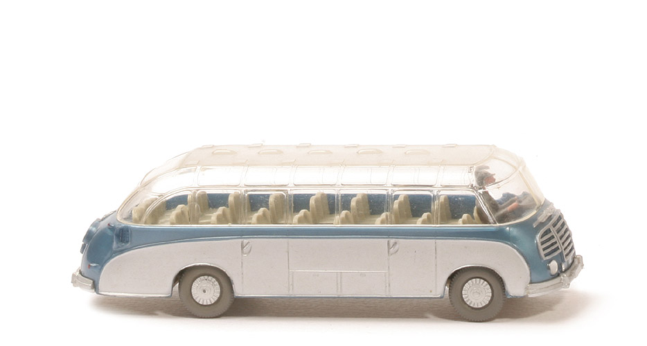 Karosserie Typ | Serie | Karosserie Farbe | blaumetallic | Schlitze für Dach | lang und schmal | Armaturenbrett | trapezförmig | Gestaltung Zierline Front | mit Punkt, gesilbert | Boden Fahrgastraum | mit Struktur | Gestaltung Seite | Schablonierung silber | Fahrersitz Farbe | hellgelbgrau | Sitzreihen | hellgelbgrau, gesteckt | Fahrer Typ | groß, mit Mütze | Fahrer Farbe | ca. basaltgrau | Lenkrad Typ | drei Speichen | Lenkrad Farbe | basaltgrau | Dach Befestigung | gesteckt | Dach Gestaltung oben | mattiert | Dach Typ Haltenasen | lang und dünn | Chassis Farbe | hellgelbgrau | Chassis Typ | Typ 2 | Achshalterungen hierbei | geschlossen | Bodenprägung hierbei | WM im Kreis | Bemalung Hauptscheinwerfer | silber | Bemalung Nebelscheinwerfer | silber | Bemalung Grill und Zierlinie | silber | Bemalung Stoßstangen | silber | Bemalung Rückleuchten | rot | Bemalung Blinker hinten | rot | Bemalung Kennzeichen hinten | silber | Bemalung 3 Zierlinien hinten | silber | Bemalung Lüfter | ohne | Räder Typ | Trilex Bus, mit Profil | Räder Ausführung | staubgrau, Felgen gesilbert |