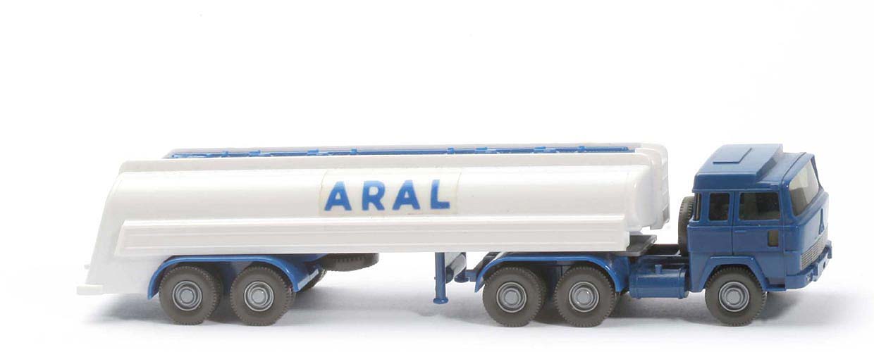 | Zugmaschine | Kabine oben | kobaltblau | Kabine unten | kobaltblau | Verglasung | getönt | Inneneinrichtung | ca. hellgelbgrau | Lenkrad | ohne | Grill | silber | Chassis | kobaltblau | Radlauf hinten | kobaltblau | Sattelpfanne | für großen Königsbolzen | Reserverad | hinter Kabine | Räder | Profil fein | Radkappen | silber | | Auflieger | Farbe Tank | weiß | Farbe Füllanlage | helles kobaltblau | Farbe Armaturen hinter Klappe | helles kobaltblau | Farbe Chassis | helles kobaltblau | Beschriftung Seite | Aral | Beschriftung Heck | Aral | Beschriftung - Art | Folien | Achseinheit - Farbe | helles kobaltblau | Typ Achseinheit | Germany/Wiking | Bodenprägung Chassis | Wiking, ohne 80 S | Königsbolzen | groß | Reserverad | mit | Räder | Profil fein | Radkappen | silber |