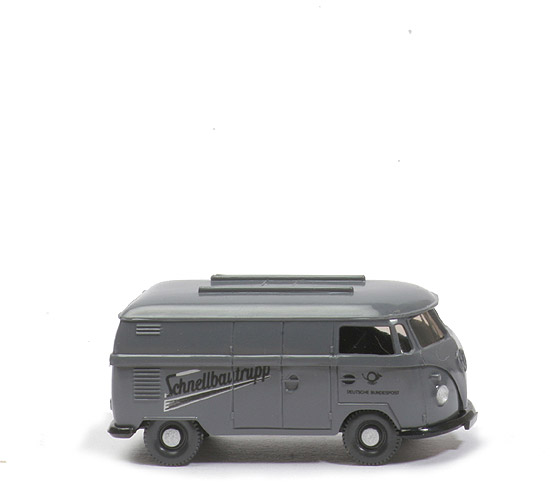 Farbe Karosserie oben | basaltgrau | Farbe Karosserie unten | basaltgrau | Heckscheibe | groß | Chassis Ausführung | separates Bauteil | Dach | mit 2 starken Längstraversen | Verglasung | klar | Inneneinrichtung | ohne | Chassis Farbe | schwarz | Bodenprägung | Wiking Germany | Beschriftung | Posthorn, Deutsche Bundespost | Beschriftung Art | Druck | Bedruckung vorne | Scheinwerfer silbern | Bedruckung hinten | Kennzeichen eingedruckt, Schnellbautrupp | sonst. Bedruckung | Schnellbautrupp | Räder | anthrazit, 8 mm | Felgen | silbern bemalt |