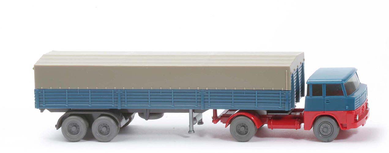 | Zugmaschine | Kabine oben | azurblau | Kabine unten | rot | Verglasung | getönt | Stege für Inneneinrichtung | nein | Chassistyp | alt | Zughaken | mit | Fläche hinter Sattelpfanne | geriffelt | Chassisfarbe | rot | Sattelpfanne | alt, mit Steg, für kleinen KöBo | Reserverad | ohne | Räder | einteilig hellgrau | | Auflieger | Farbe Pritsche | azurblau | Pritschentyp | ohne Lasche | Chassis | anthrazit | Prägung Chassis | Wiking | Pritscheneinlage | silber | Achseinheit | anthrazit | Bodenprägung Achseinheit | Made in Germany | Königsbolzen | dünn, integriert | Plane | Seite glatt., vorne Aussp | Plane Farbe | olivgrau | Räder | einteilig hellgrau |