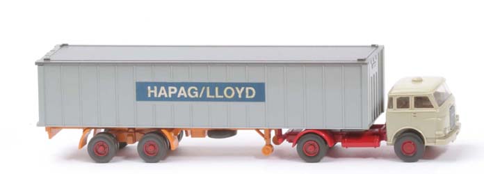 | | Zugmaschine | | Fahrerhaus | hellgelbgrau | | Verglasung | klar | | Sitze | rot | | Kabinenboden | hellgelbgrau | | Chassis | rot | | Sattelpfanne | alt, mit Steg, für kleinen KöBo | | Fläche hinter Sattelpfanne | geriffelt | | Reserverad | ohne | | Räder | Profil fein | | Felgen | hellbraunrot | | | Container | | Typ | 40 ft, gerippt | | Farbe Dach | basaltgrau | | Farbe Korpus | silbergrau | | Beschriftung | Hapag-Lloyd | | Beschriftung - Art | Papieraufkleber | | Beschriftung - Grösse | 7 Felder | | untere Kante | schmal | | | Auflieger | | Bolzen | dünn | | Unterfahrschutz | ohne | | Farbe | gelborange (Werbe) | | Räder | Profil fein | | Felgen | hellbraunrot |