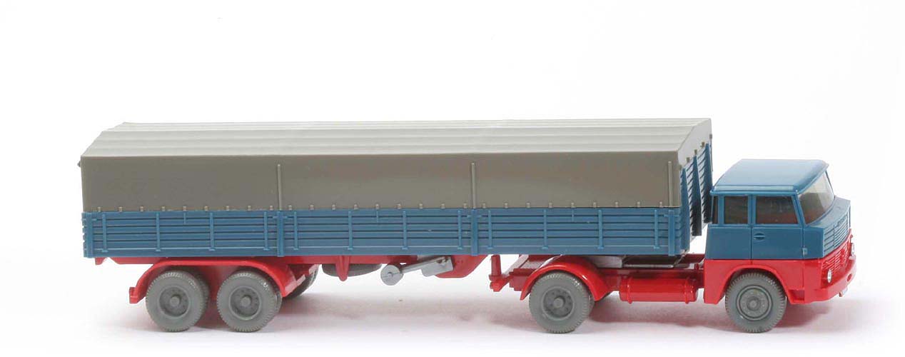 | Zugmaschine | Kabine oben | azurblau | Kabine unten | rot | Verglasung | getönt | Stege für Inneneinrichtung | ja | Chassistyp | alt | Zughaken | mit | Fläche hinter Sattelpfanne | geriffelt | Chassisfarbe | rot | Sattelpfanne | alt, mit Steg, für kleinen KöBo | Reserverad | ohne | Räder | einteilig hellgrau | | Auflieger | Farbe Pritsche | azurblau | Pritschentyp | ohne Lasche | Chassis | rot | Prägung Chassis | Wiking - ohne 51 h | Pritscheneinlage | silber | Achseinheit | rot | Typ Achseinheit | Made in Germany 2b | Königsbolzen | dünn, Pilzform, eingeklebt | Stütze | beweglich | Plane | Seite 2 Mark., vorne Aussp | Plane Farbe | betongrau | Räder | einteilig hellgrau |