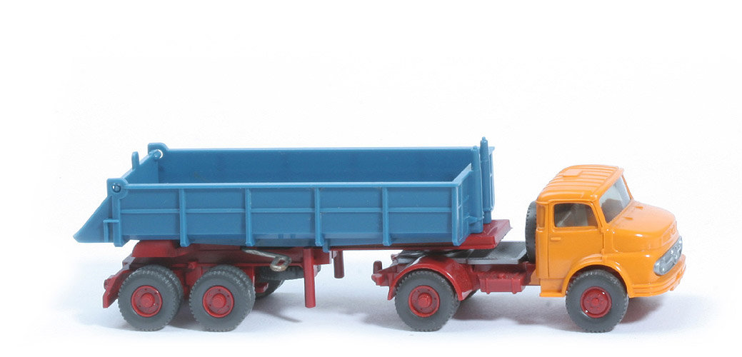 | Zugmaschine | Farbe Kabine | gelborange | Lüfter | mit | Eckfenster | mit | Blinker | auf Kotflügel | Inneneinrichtung | ca. lichtgrau | Verglasung | getönt | Chassis | hellbraunrot | Radlauf hinten | hellbraunrot | Sattelpfanne | für großen Königsbolzen | Reserverad | hinter Kabine | Räder | 12mm, Profil grob | Felgen | hellbraunrot | | Auflieger | Farbe Mulde und Klappe | azurblau | Farbe Chassis | hellbraunrot | Bodenprägung Chassis | Wiking Germany | Farbe Scharnierhalterung | hellbraunrot | Farbe Achshalterung | rubinrot | Bodenprägung Achshalterung | 67 S | Königsbolzen | stark | Reserverad | unter Chassis | Räder | 12mm, Profil grob | Felgen | hellbraunrot |