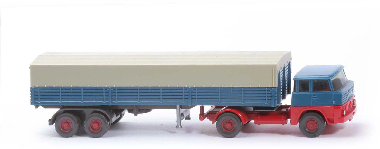 | Zugmaschine | Kabine oben | azurblau | Kabine unten | rot | Verglasung | getönt | Stege für Inneneinrichtung | ja | Chassistyp | alt | Zughaken | mit | Fläche hinter Sattelpfanne | geriffelt | Chassisfarbe | rot | Sattelpfanne | alt, mit Steg, für kleinen KöBo | Reserverad | ohne | Räder | 12mm, Profil fein | Felgen | hellbraunrot | | Auflieger | Farbe Pritsche | azurblau | Pritschentyp | ohne Lasche | Chassis | anthrazit | Prägung Chassis | Wiking | Pritscheneinlage | silber | Achseinheit | anthrazit | Typ Achseinheit | Made in Germany 2b | Königsbolzen | dünn, integriert | Plane | Seite glatt., vorne Aussp | Plane Farbe | hellgelbgrau | Räder | 12mm, Profil fein | Felgen | hellbraunrot |