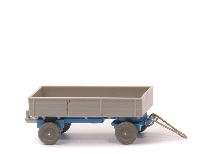 | Pritsche | Pritsche Farbe | platingrau | Pritschenseiten | Struktur | Pritscheneinlage | ohne | Kennzeichen hinten | zweiteilig | | Chassis | Chassis Farbe | himmelblau | Chassis Variante | Typ 1 | Achshalterungen | geschlossen | Drehschemel | vernietet | Bodenprägung Drehschemel | ohne | Bodenprägung Chassis | ohne | Zughaken | silbern, eingesetzt in Chassisschlitz | | weitere Details | Deichsel | Metall | Bemalung Rückleuchten | rot | Bemalung Kennzeichen | silbern | Räder | 10mm, mit Profil, staubgrau, älterer Typ |
