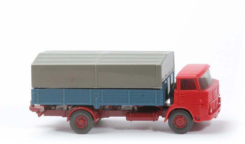 | Kabine oben | rot | | Kabine unten | rot | | Verglasung | getönt | | Chassis Farbe | hellbraunrot | | Pritschen-Halterung | hellbraunrot | | Pritsche | neu, azurblau | | Pritscheneinlage | silber | | Plane | betongrau | | Reserverad | hinter Kabine | | Zughaken | Dreieck | | Bemalung | ohne | | Räder | 12mm, Profil grob | | Felgen | hellbraunrot |