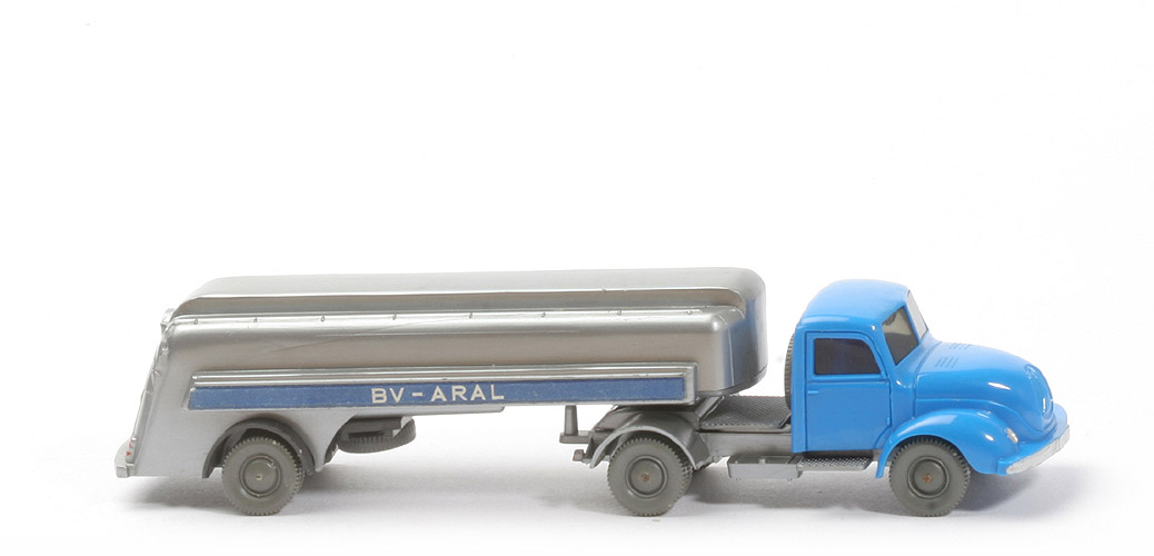 | Zugmaschine | Farbe Kabine | himmelblau | Version Kabine | Typ 4 - ohne Blinker | Stoßstange | senkrecht | Verglasung | getönt | Chassis | Typ 3a, silber | Bemalung | Scheinwerfer, Stoßstange | Sattelpfanne | alt, ohne Steg, für kleinen KöBo | Achshalterungen | offen | Bodenprägung | WM, Made in Germany | Reserverad | hinter Kabine | Räder | 10mm, neuere Ausführung | | Auflieger | Farbe Oberteil | silber | Farbe Unterteil | silber | Farbe Achseinheit | anthrazit | Königsbolzen | integriert, mit Ring | Position Königsbolzen | zentral auf Aufnahmeplatte | Bodenprägung Auflieger Chassis | ohne | Achshalterungen | geschlossen | Bodenprägung Achseinheit | WM im Kreis | geprägter Streifen | schmal | Beschriftung | BV-ARAL (s. Foto) | Beschriftung Art | Papieraufkleber, auch Heck | Bemalung | Rückleuchten rot | Räder | 10mm, neuere Ausführung |