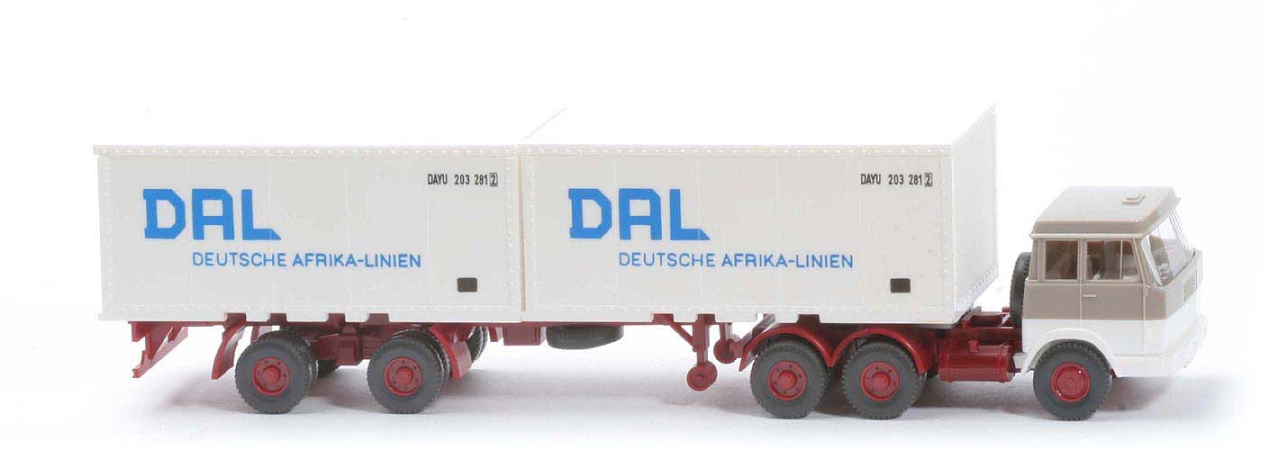 | Zugmaschine | Kabine oben | graubeige | Kabine unten | weiß | Verglasung | klar | Inneneinrichtung | ca. graubeige | Lenkrad | mit | Chassis | weinrot | Radlauf hinten | weinrot, 2-teilig | Sattelpfanne | für großen Königsbolzen | Reserverad | hinter Kabine | Räder | Profil grob | Felgen | hellbraunrot | | Container | Art | 2 x 20 ft neu | Farbe | weiß | Türen | alt | Beschriftung | DAL (s. Foto) | Beschriftung Art | Druck azurblau/schwarz | | Auflieger | Farbe | weinrot | Unterfahrschutz | mit | Königsbolzen | stark | Räder | Profil grob | Felgen | hellbraunrot |