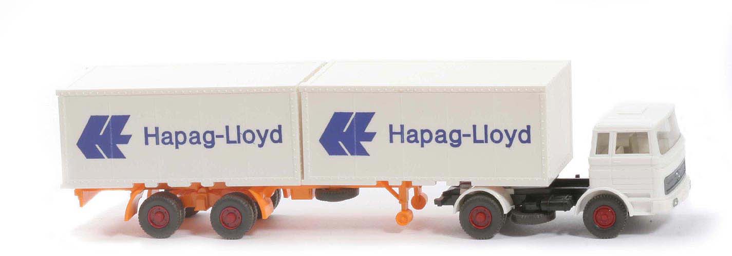 | Zugmaschine | Kabine oben | weiß | Kabine unten | weiß | Streifen | ohne | Verglasung | klar | Inneneinrichtung | ca, hellgelbgrau | Lenkrad | ohne | Grill | silbern | Stoßstange, Radlauf vorn | weiß | Chassistyp | neu | Chassisfarbe | schwarz | Radlauf hinten | weiß | Reserverad | unter Chassis | Sattelpfanne | für großen Königsbolzen | Räder | 12mm, Profil grob | Felgen | hellbraunrot | | Container | Art | 2 x 20 ft neu | Farbe | weiß | Türen | alt | Beschriftung | Hapag-Lloyd (s. Foto) | Beschriftung Art | 38mm, ohne Nummer | | Auflieger | Farbe | orangegelb (wie Serie) | Unterfahrschutz | ohne | Königsbolzen | stark | Räder | 12mm, Profil grob | Felgen | hellbraunrot |