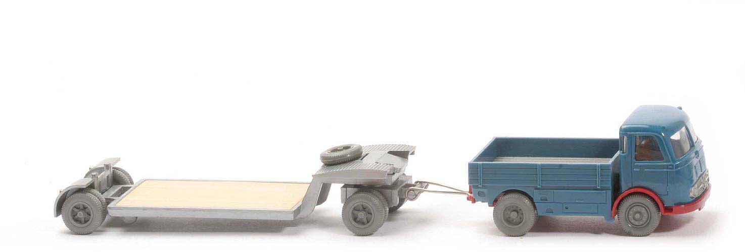 | Zugmaschine | Kabine Farbe | azurblau | Fenstersteg | breit | Fixierung Reserverad | mit | Verglasung | klar | Inneneinrichtung | hellbraunrot | Grill | silbern eingesetzt | Chassis | hellbraunrot | Bodenprägung | WM, Made in Germany | hintere Stoßstange links | mit | Zughaken | mit | hintere Stoßstange rechts | mit | Pritsche | azurblau | Pritscheneinlage -Typ | Längsverbretterung, 12-geteilt | Pritscheneinlage - Farbe | silber | Räder | 12mm, hellgrau, 10-Loch | Ladegut | ohne | | Anhänger | Grundfarbe | silber | Hängertyp | Typ 2: Zapfen ohneJustierung | Pritscheneinlage | hellbeige | Deichsel | Metall | Bemalung Rückleuchten | rot | Bemalung Rückstrahler | ohne | Räder | 12mm, hellgrau, 10-Loch |