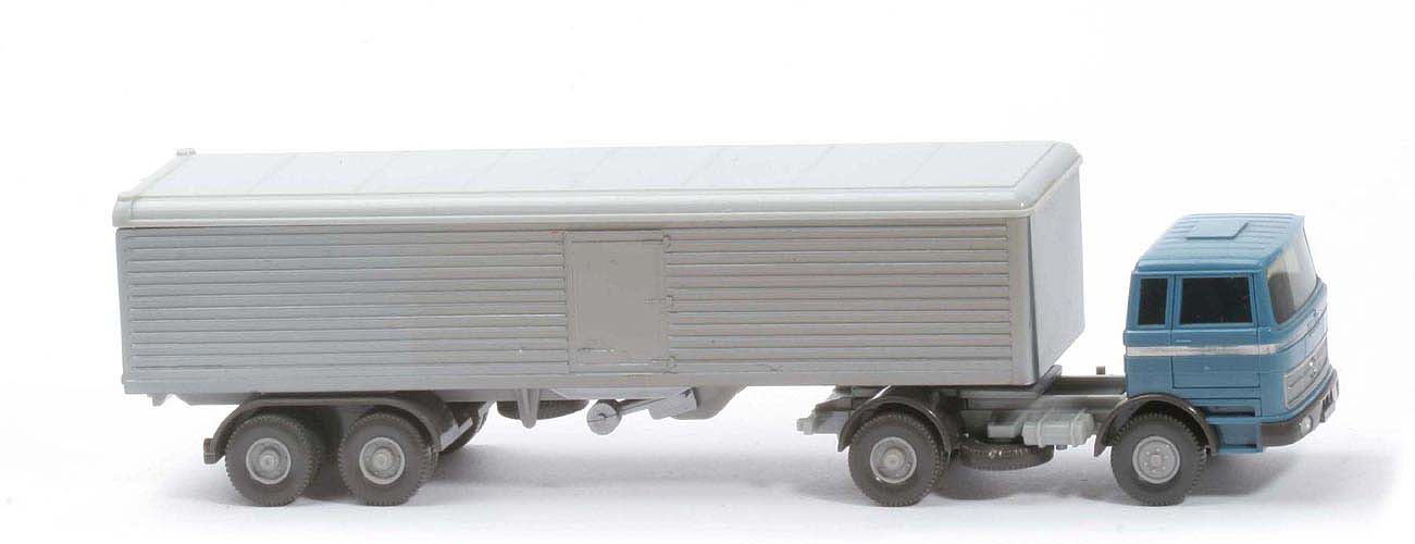 | | Zugmaschine | | Kabine oben | hellazurblau | | Kabine unten | hellazurblau | | Streifen | mit | | Verglasung | getönt | | Inneneinrichtung | ohne | | Grill | silbern | | Stoßstange, Radlauf vorn | anthrazit | | Chassistyp | alt | | Chassisfarbe | lichtgrau | | Radlauf hinten | anthrazit | | Reserverad | unter Chassis geklebt | | Sattelpfanne | neu, für dünnen Bolzen | | Räder | 12mm, Profil fein | | Felgen | silbergrau | | | Auflieger | | Kofferdach | lichtgrau | | Türen | lichtgrau | | Koffer Korpus | silber | | Chassis | lichtgrau! | | Achseinheit | staubgrau | | Bodenprägung Achseinheit | Made in Germany | | Stütze | beweglich | | Königbolzen | eingesetzt, eckig | | Reserverad | mit Felge | | Räder | 12mm, Profil fein | | Felgen | silbergrau |