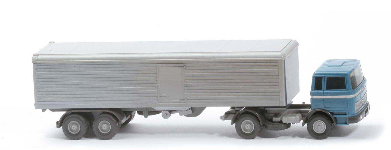 Dach und Türen hellgraubeige, Aufliegerchassis staubgrau, Bolzen eingesetzt eckig, mit Aufliegerreserverad. |