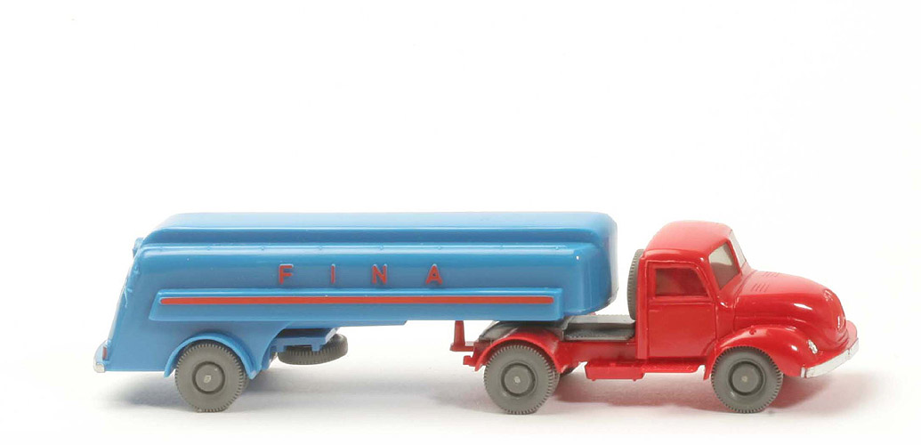 | | Zugmaschine | | Farbe Kabine | rot | | Version Kabine | Typ 4a | | Stoßstange | senkrecht | | Kabine unten | mit Schlitz | | Blinker | mit | | Verglasung | getönt | | Farbe Chassis | rot | | Bemalung | Scheinwerfer, Stoßstange | | Sattelpfanne | alt, mit Steg, für kleinen KöBo | | Achshalterungen | offen | | Bodenprägung | WM (ohne Kreis) | | Reserverad | hinter Kabine | | Räder | 11 mm | | | Auflieger | | Farbe Oberteil | himmelblau | | Farbe Unterteil | himmelblau | | Farbe Achseinheit | himmelblau | | Königsbolzen | integriert, mit Ring | | Position Königsbolzen | zentral auf Aufnahmeplatte | | Bodenprägung Auflieger Chassis | ohne | | Achshalterungen | offen | | Bodenprägung Achseinheit | WM (ohne Kreis) | | geprägter Streifen | breit | | Beschriftung | Fina (s. Foto) | | Beschriftung Seite | geprägt | | Beschriftung Heck | Papieraufkleber | | Bemalung Rückleuchten | rot | | Bemalung Stoßstange | silber | | Räder | 11 mm |